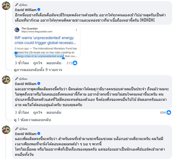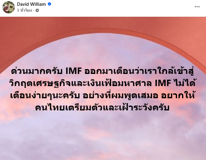 วันที่ 15 เมษายน 2569 ครูเดวิด ครูสอนภาษาชื่อดัง ออกมาโพสต์ข้อความเตือนคนไทยผ่านเฟซบุ๊กชื่อ David William ให้เฝ้าระวังและเตรียมตัว โดยระบุว่า
